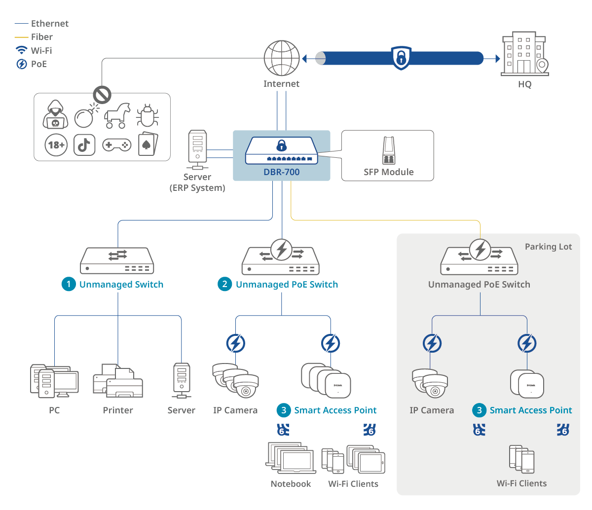 Grâce à une interface utilisateur Web intuitive, le DBR-700 surveille de manière centralisée l’ensemble de l’état du réseau et gère facilement la configuration des fonctionnalités avancées. La gestion sans fil intégrée prend en charge jusqu’à 15 appareils Smart AP(DBR-X3000-AP), simplifiant les tâches administratives telles que les paramètres radio, la surveillance client et le contrôle d’accès. Une gestion simplifiée et des informations en temps réel sur l’activité du réseau aident les petites entreprises à améliorer leur efficacité opérationnelle globale.