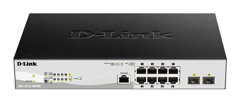 Řízené přepínače řady DGS-1210/ME se dodávají v různých sestavách portů Gigabit Ethernet RJ-45 a SFP. Přepínače DGS-1210-10P/ME, DGS-1210-28P/ME a DGS-1210-52MP/ME jsou vybaveny funkcí Power over Ethernet (PoE/PoE+), která umožňuje instalaci kompatibilních PoE zařízení na až 100m vzdálených místech bez okamžitého přístupu k napájecím zásuvkám.