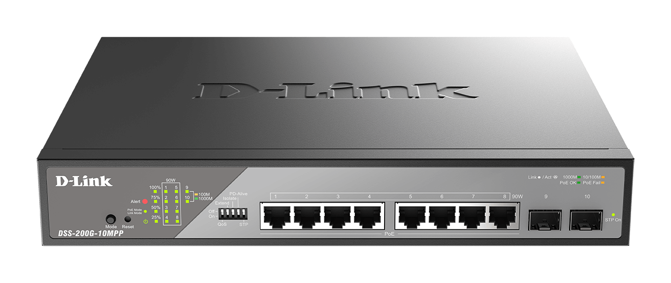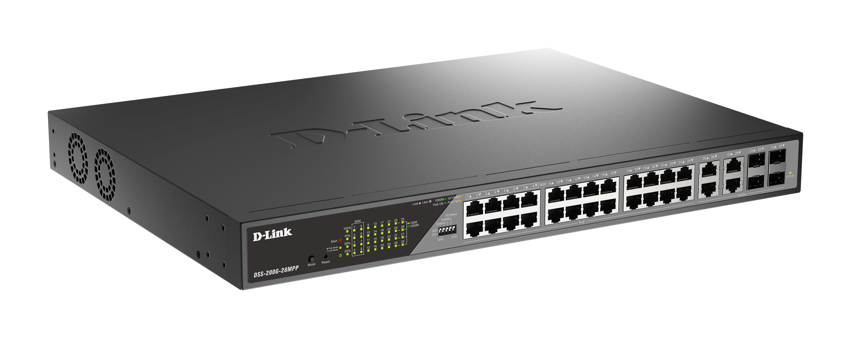 LED signalizace 25 %, 50 %, 75 % a 100 % využití celkového výkonu PoE. Výkon až 518 W můžete rychle nasadit na více zařízení. Např. u modelu DSS-200G-28MPP je dostupných 90 W na 8 portech a 30 W na 16 portech.