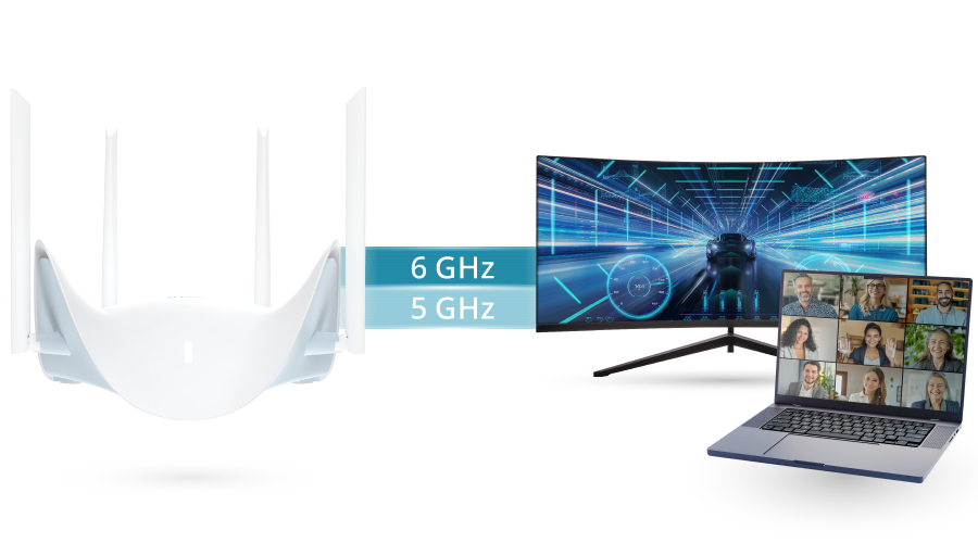 - Třípásmový výkon: 2,4 GHz, 5 GHz a 6 GHz s využitím ultraširokých kanálů 320 MHz.Technologie