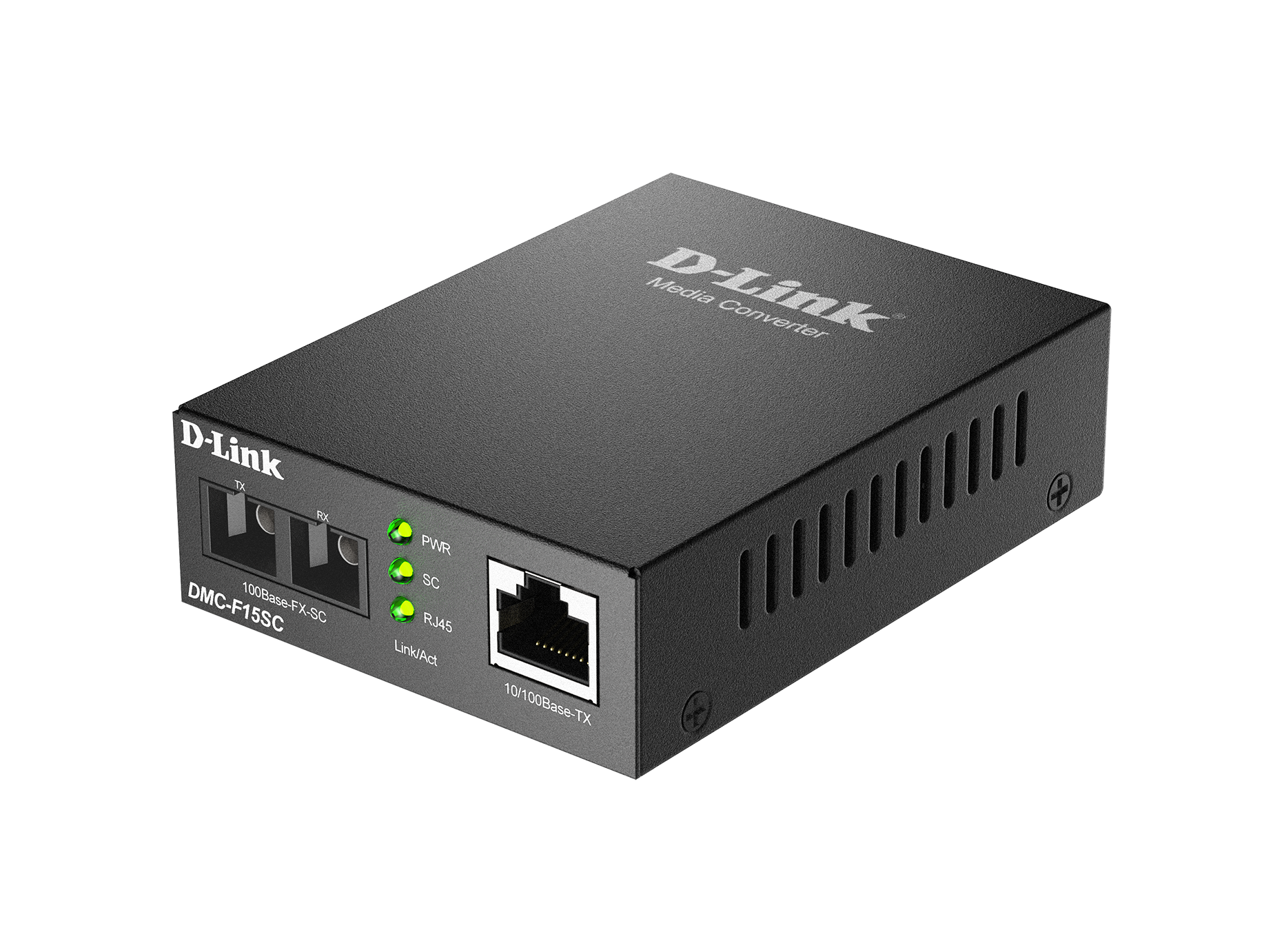The DMC-F15SC is a standalone media converter designed to convert a twisted-pair 10/100Base- TX Fast Ethernet connection to a single-mode fibre 100Base-FX Fast Ethernet connection to extend a connection distance (up to 15 km) between two devices. This media converter is equipped with one RJ-45 for twisted-pair and one fibre optic SC port.