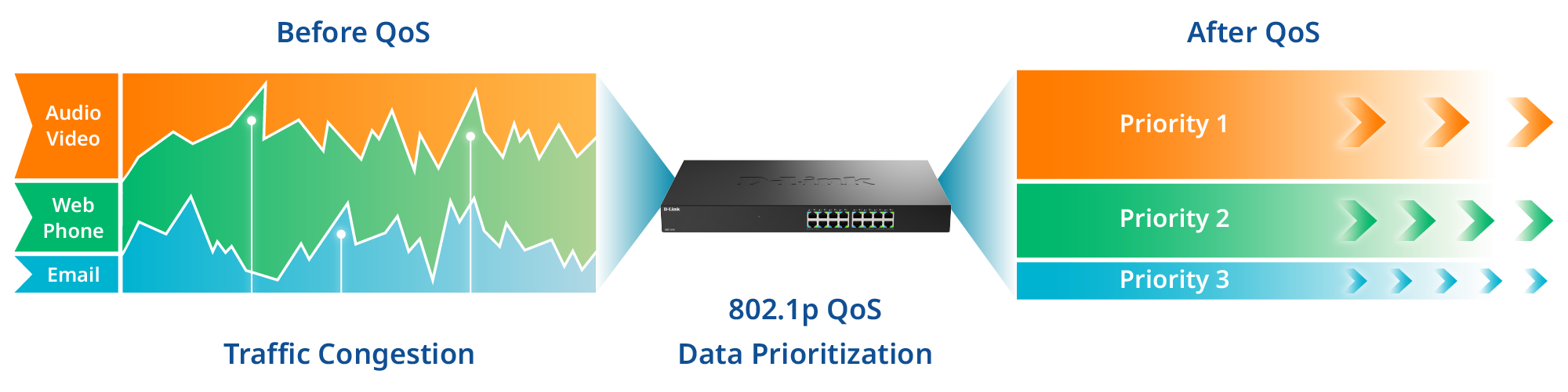 With the DMS-1016, you can effortlessly manage your network traffic with the 802.1p Quality of Service (QoS) feature. The switch automatically organizes and prioritizes time-sensitive and critical data for efficient delivery, enabling buffer-free video streaming as well as jitter-free video and voice calls.