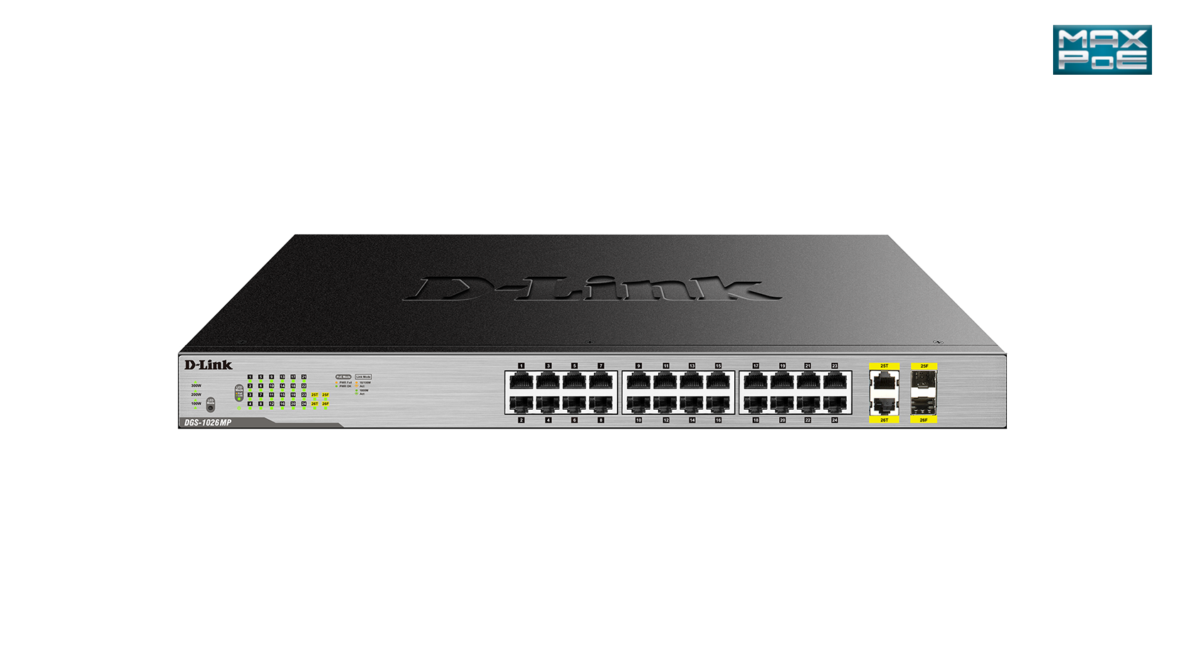 The DGS-1026MP features 24 10/100/1000BASE-T ports that support the IEEE 802.3at PoE+ standard. Each of the 24 PoE ports can supply up to 30 W, with a total PoE budget of 370 W.
