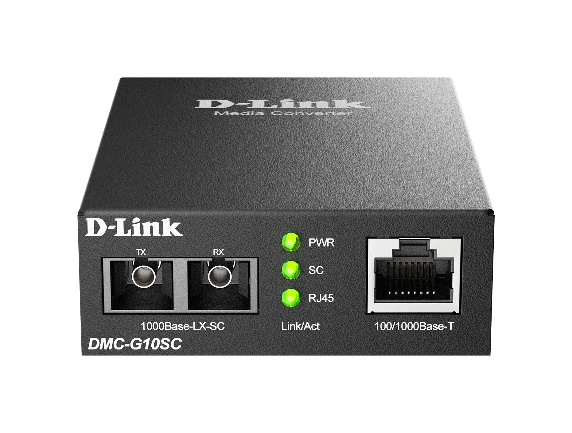 The DMC-G10SC is a media converter designed to convert a twisted-pair 100/1000Base-T Gigabit Ethernet connection to a single-mode fibre 1000Base-LX Gigabit Ethernet connection to extend a connection distance (up to 10 km) between two devices. This media converter is equipped with one RJ-45 for twisted-pair and one fibre optic SC port.