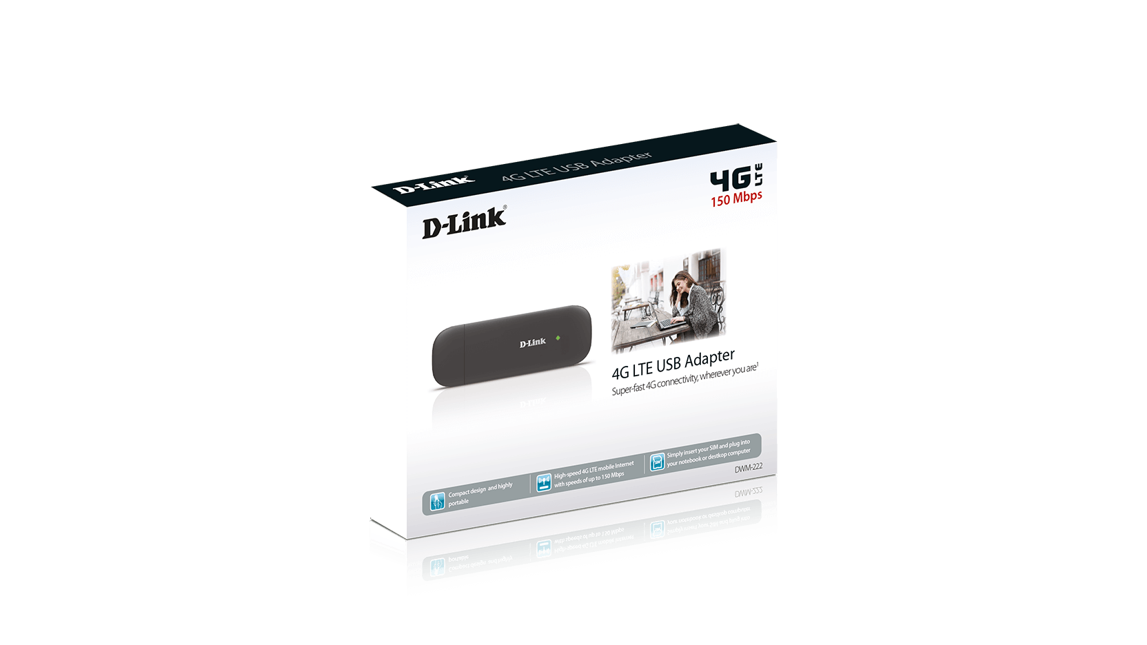 Simply plug the 4G LTE USB Adapter into your computer and get Internet access anywhere you can receive an LTE signal (also backwards compatible with HSPA, GSM, GPRS, or EDGE data signal). The DWM-222 also has an integrated antenna for a connection that is consistent and reliable whether you’re in a coffee shop, attending a business meeting or working from a hotel.