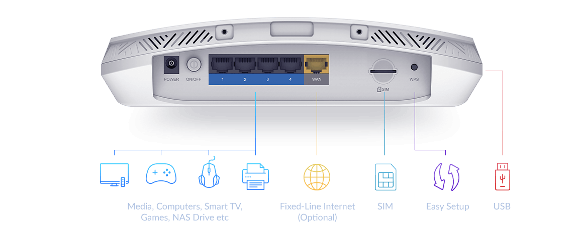 Με τέσσερις θύρες LAN Gigabit, συνδέστε έως και 4 ενσύρματες συσκευές για αξιόπιστες ταχύτητες ενσύρματης σύνδεσης έως και 10 φορές γρηγορότερες από τις τυπικές συνδέσεις Fast Ethernet.