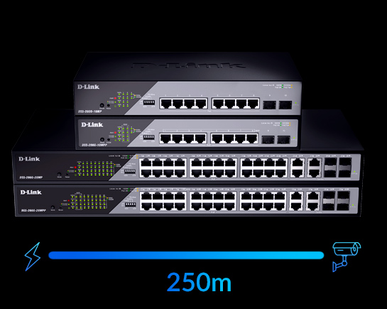 Unlike traditional PoE switches which only send power and data over a 100m distance, long-range PoE switches offers a substantially increased distance of up to 250m. Ideal for surveillance cameras that need to be deployed at a much greater distance from the switch. And if further distance is needed, using a PoE extenders can increase the distance even further for up to a maximum of 650m.