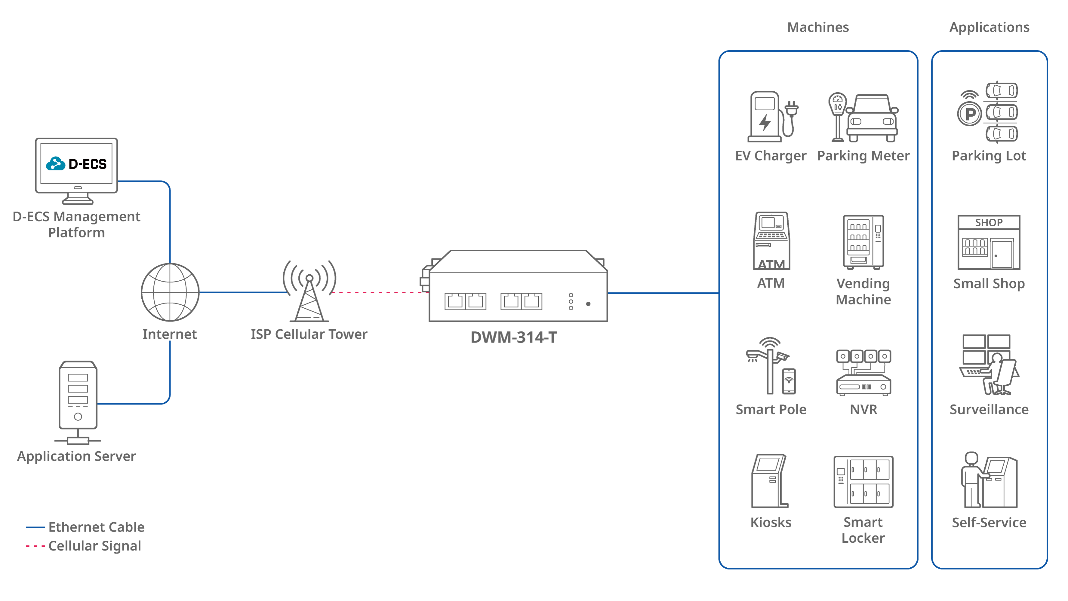 M2M 4G-modemet DWM-314-T med Multi-Connect-funktionalitet erbjuder omedelbar åtkomst med sina 4G LTE- och Ethernet-gränssnitt, vilket ger en verklig plug-and-play-upplevelse som är idealisk för mångsidiga tillämpningar. Detta modem möjliggör anslutning med kabel till nästan alla enheter, från elbilsladdare och parkeringsmätare till bankomater, automater, smarta stolpar, NVR:er, kiosker och smarta skåp. Den är perfekt för integrering i olika miljöer som parkeringsplatser, butiker, övervakningssystem och självbetjäningsstationer. För anpassade konfigurationer möjliggör det användarvänliga webbgränssnittet enkla justeringar via valfri webbläsare.