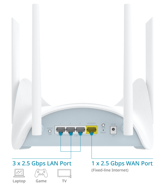 Överför data samtidigt över olika band för att minimera överbelastning - Gigabit -anslutning: En 2,5-Gigabit WAN-port och 3 x 2,5-Gigabit LAN-portar