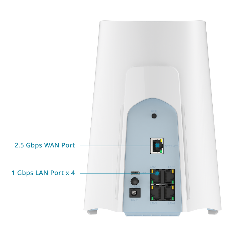 1 x 2.5 Gigabit Ethernet WAN port 4 x Gigabit Ethernet LAN port 1x USB Type-C 1 x power connector 1 x WPS button 1 x Power button |