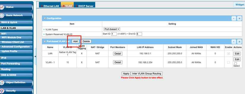 6. In Basic Network > LAN and VLAN > LAN tab, click the Add button to add a new VLAN ID. This setting can prevent guest users from accessing the LAN port of the devices.