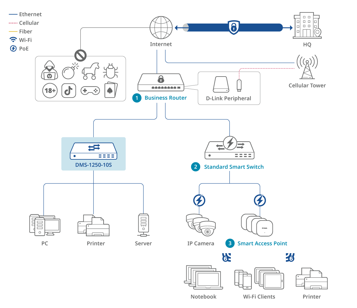 De switches uit de DMS-1250-serie zijn veelzijdig en geschikt voor SOHO-, SMB- en MDU-omgevingen. Ze bieden snelle gegevensoverdracht met 2,5GE en een cruciale 10G-uplink voor externe connectiviteit. Deze high-speed uplink zorgt ervoor dat de hele MDU toegang heeft tot externe diensten zonder te kampen met data-bottlenecks. Bovendien implementeren ze effectief IEEE 802,3at of IEEE 802,3bt in DMS-1250-10SP, 10SPL en 12TP om apparaten in staat te stellen stroom aan te sluiten en te ontvangen.