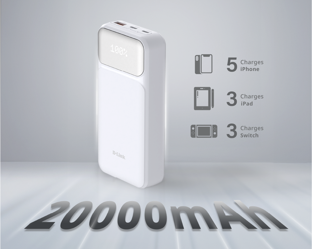 De D-Link DPP-201 is een compacte maar krachtige oplossing voor al uw laadbehoeften. Met een hoge capaciteit van 20.000 mAh werkt uw apparaat langer, of u nu op reis bent, op afstand werkt of onderweg bent. De DPP-201 kan 5 keer een iPhone X of 3 keer een iPad mini of een Nintendo Switch opladen.*