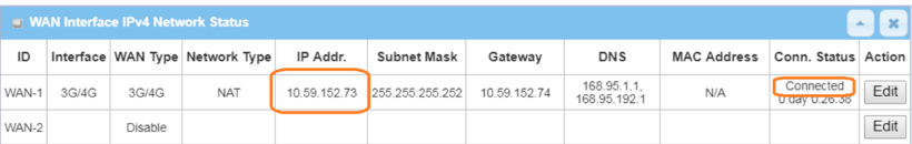 1. Before WireGuard server configuration, please check the WAN interface status and make sure the M2M router/gateway WAN interface has already obtained a public IP address.