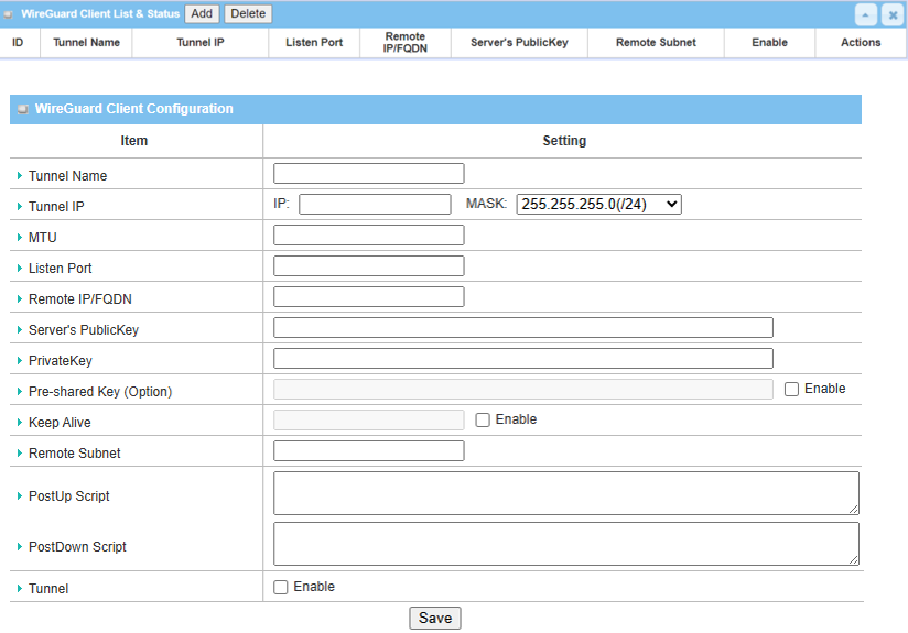 2. Click the Add button of WireGuard Client & Status to create WireGuard Client Configuration.