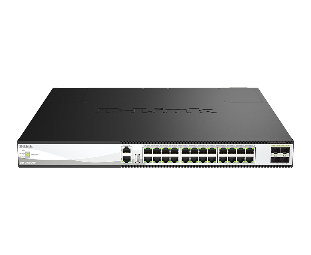 The DXS-3130-28P supports 802.3af/at/bt PoE standards, delivering up to 60 W per port with Perpetual and Fast PoE.