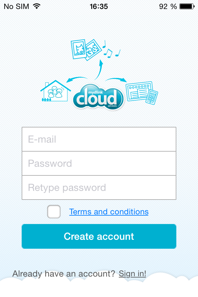 Start the Mydlink app and login with your Mydlink account or click the Sign up to register for a new account.