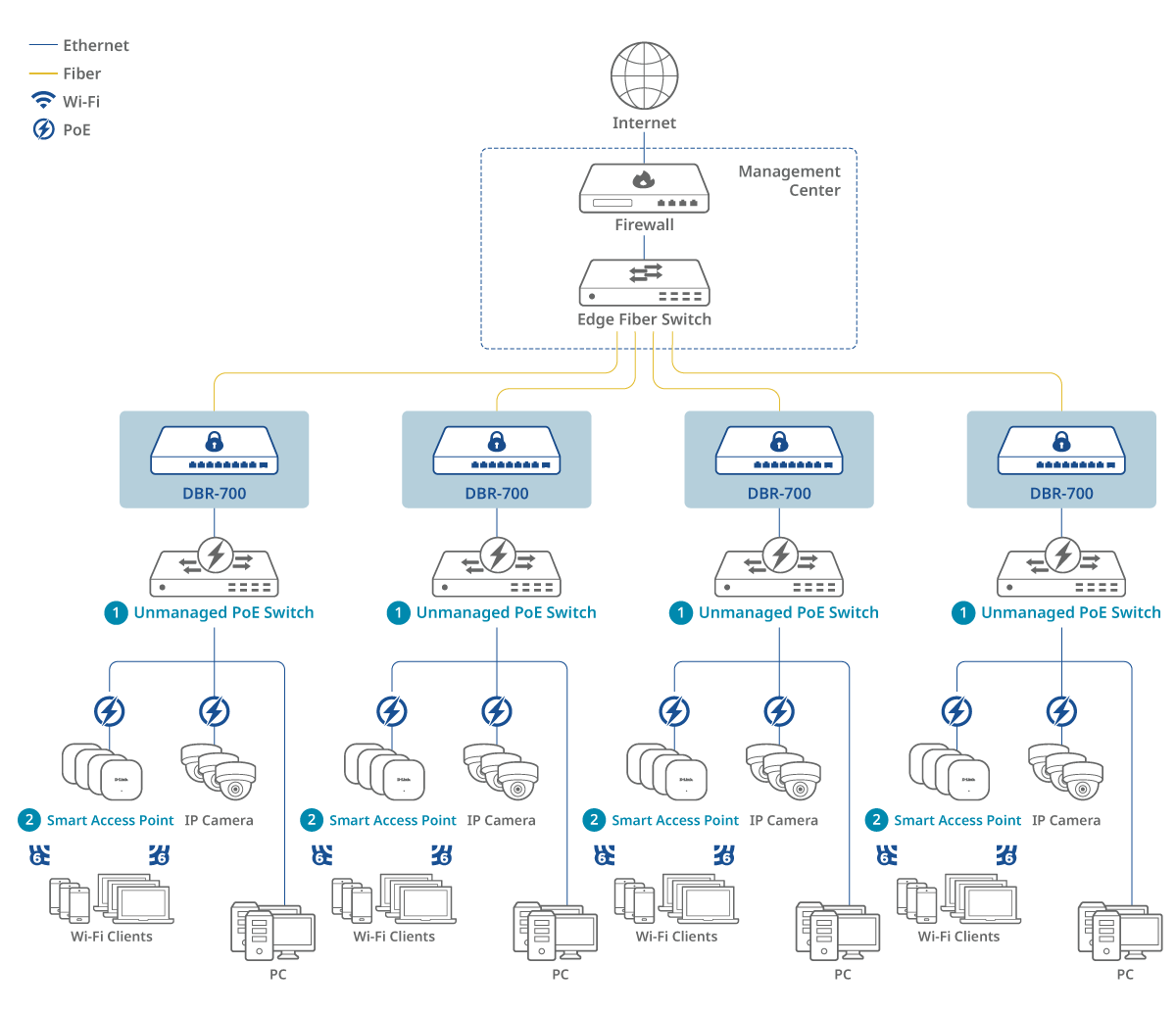 Über eine intuitive Web-Benutzeroberfläche überwacht der DBR-700 zentral den gesamten Netzwerkstatus und verwaltet auf einfache Weise die Konfiguration erweiterter Funktionen. Die integrierte Wireless-Verwaltung unterstützt bis zu 15 AP (DBR-X3000-AP)-Geräte und vereinfacht so administrative Aufgaben wie Funkeinstellungen, Client-Überwachung und Zutrittskontrolle. Eine einfache Verwaltung und ein Echtzeit-Monitoring des Netzwerks helfen Unternehmen die Effizienz zu steigern.