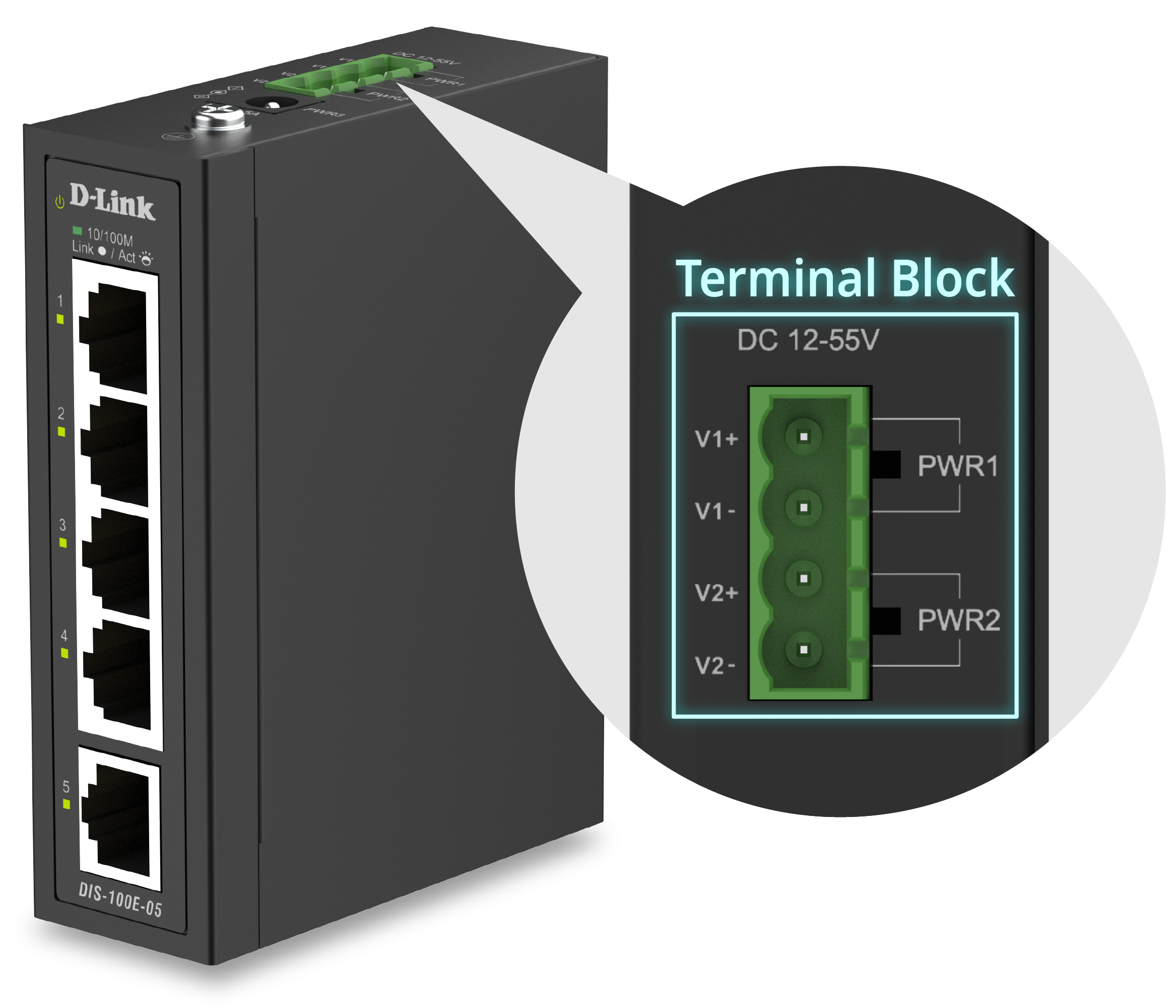 The DIS-100E-05 is equipped with dual power supply options. Each is capable of independently powering the device. This built-in redundancy ensures continuous operation even if one power source fails, minimizing shutdown risk and maintaining network performance. As industrial environments are common with unstable power conditions, its wide voltage range of 12 – 55V DC supports diverse power sources while protecting against surges and low voltage, delivering a stable and dependable power supply.
