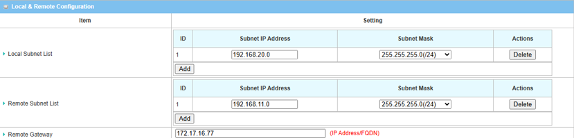 Local Subnet List Specify the local subnet IP address: 192.168.11.0 and Subnet Mask: 255.55.55.0(/24) based on this scenario