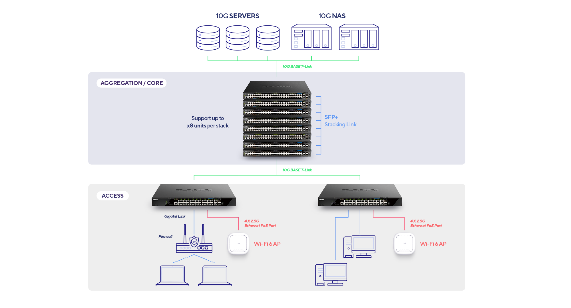 Multi-Gigabit 2.5G ports on the DGS-1520 Series PoE switches eliminate potential bottlenecks when connecting to Wi-Fi 6 access points capable of Gigabit+ wireless speeds.