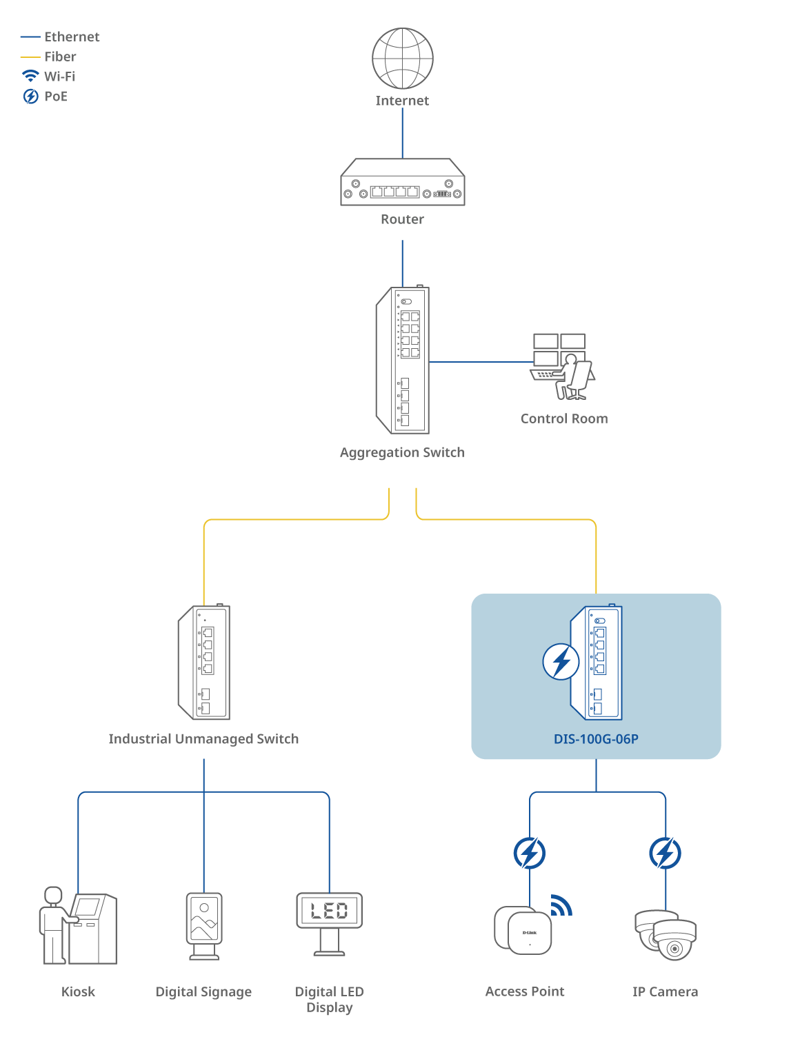 The DIS-100G-06P features two SFP ports that enable flexible, long-distance fiber connections, perfect for extending your network across remote sites or between buildings. Fiber optic cabling goes beyond the distance limitations of traditional Ethernet, offering high bandwidth and strong resistance to interference. This ensures stable, high-performance transmission in industrial environments where reliability is essential.