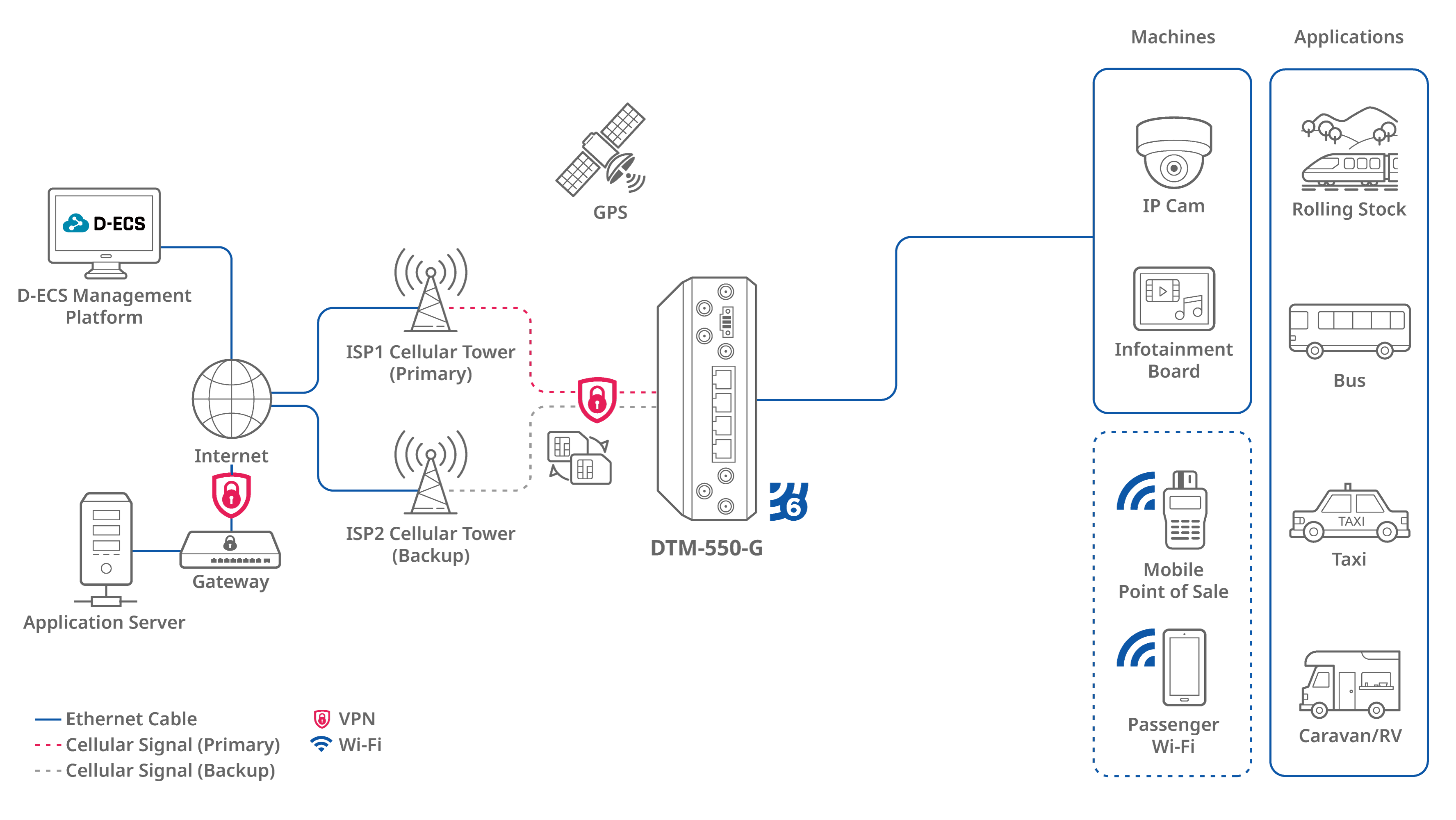 The DTM-550-G 5G Transit Gateway delivers high-speed, dual-SIM cellular service and Wi-Fi 6 for robust passenger internet. Integrated GPS supports efficient route management. Managed via D-ECS for seamless remote monitoring, it’s perfect for buses, taxis, RVs and rolling stock. Supports passenger Wi-Fi, mobile POS, IP cameras, and infotainment, ensuring efficient, seamless connectivity.​