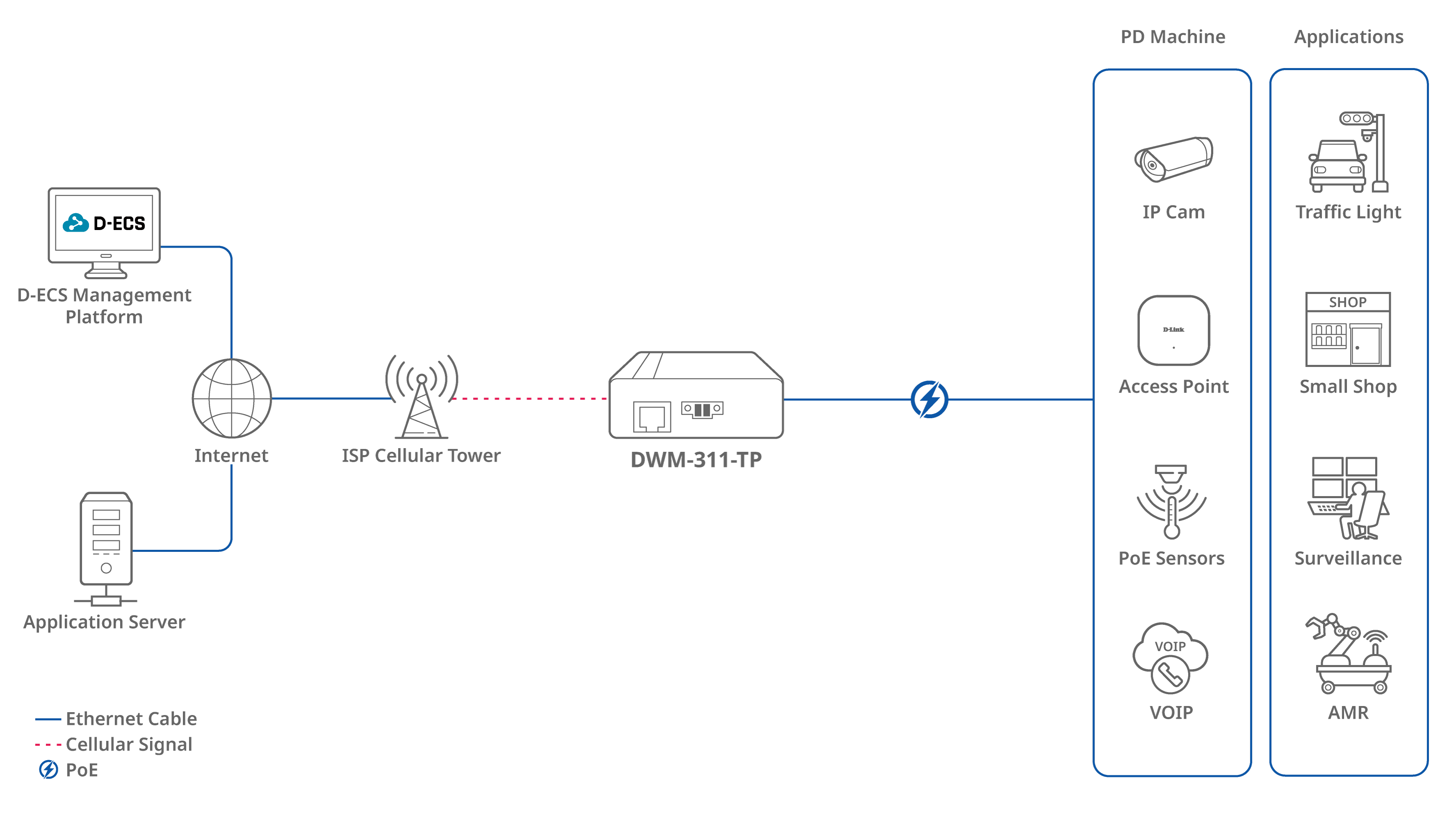 The DWM-311-TP 4G M2M PoE Modem delivers reliable 4G LTE and Ethernet connectivity for PoE devices, ensuring plug-and-play access. Its Fast Ethernet port with 802.3af/at PoE simplifies powering IP cameras, access points, PoE sensors, and VoIP systems. The auto-reboot feature guarantees uninterrupted operation by restarting unresponsive devices. Ideal for traffic systems, small shop, surveillance setups, and Autonomous Mobile Robots (AMR), the DWM-311-TP offers secure, scalable connectivity with easy web-based configuration.