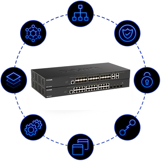The DXS-1210 series includes layer 2 features such as port mirroring, Spanning Tree Protocol (STP), and Link Aggregation Control Protocol (LACP). They also support IP interfaces, ARP, IPv6 Neighbor Discovery (ND), default routing, IPv4/IPv6 static routing, IGMP and MLD Snooping, auto voice and surveillance VLAN, LLDP and LLDP-MED.