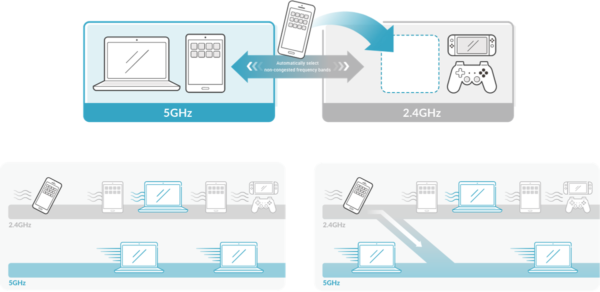 - Simple access management with one SSID for both Wi-Fi bands (2.4 and 5 GHz)