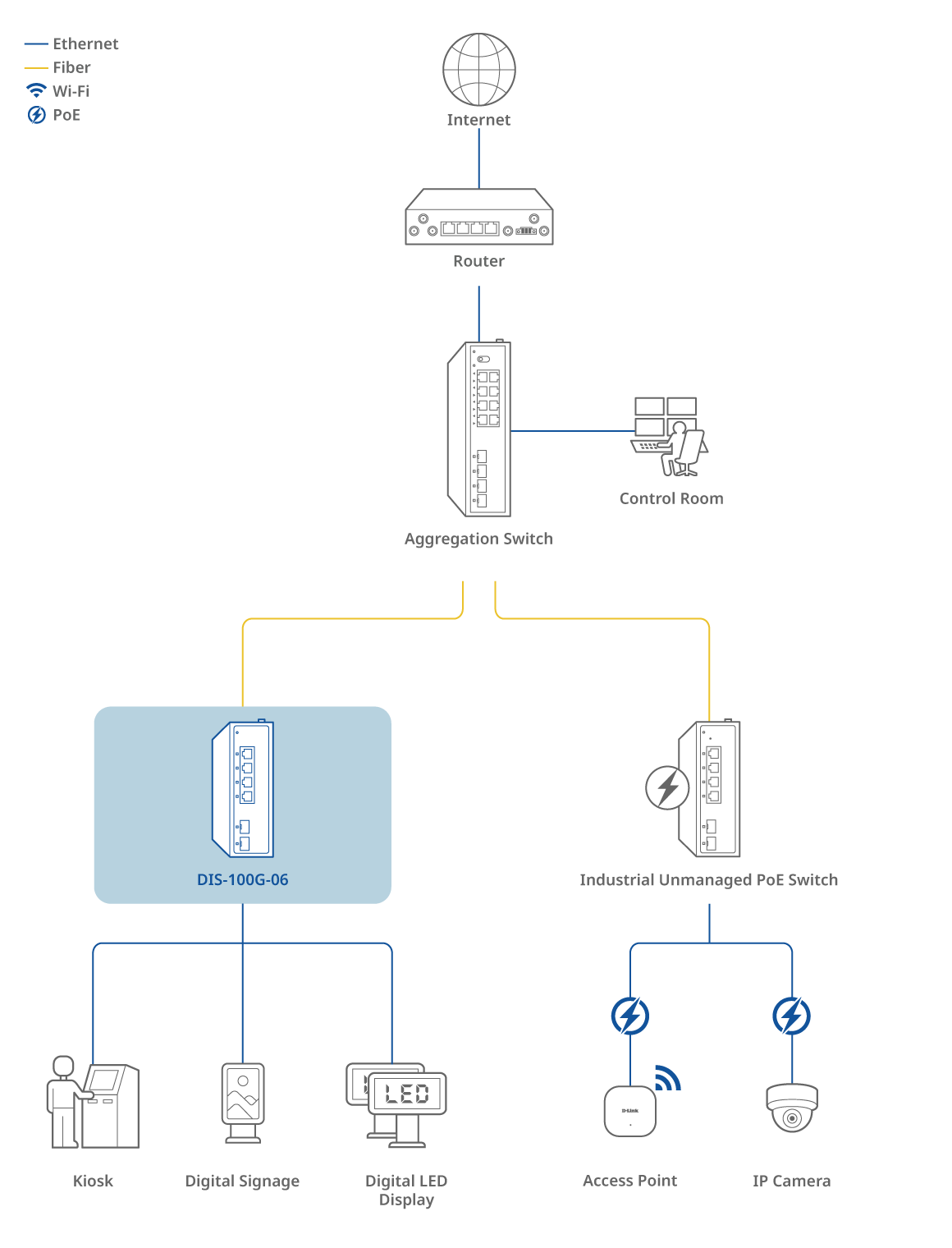 Le DIS-100G-06 est un switch industriel non administrable équipé de quatre ports 1G et de deux ports SFP, offrant une simplicité de déploiement plug-and-play. Les ports SFP prennent en charge la transmission de données longue distance, éliminant les limitations de distance des câbles Ethernet traditionnels. Grâce à un fonctionnement fiable et performant, il assure un transfert de données en temps réel et une connectivité fluide pour des applications telles que les kiosques, la signalisation numérique, les écrans LED, et bien plus encore.