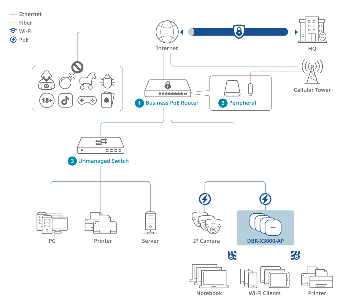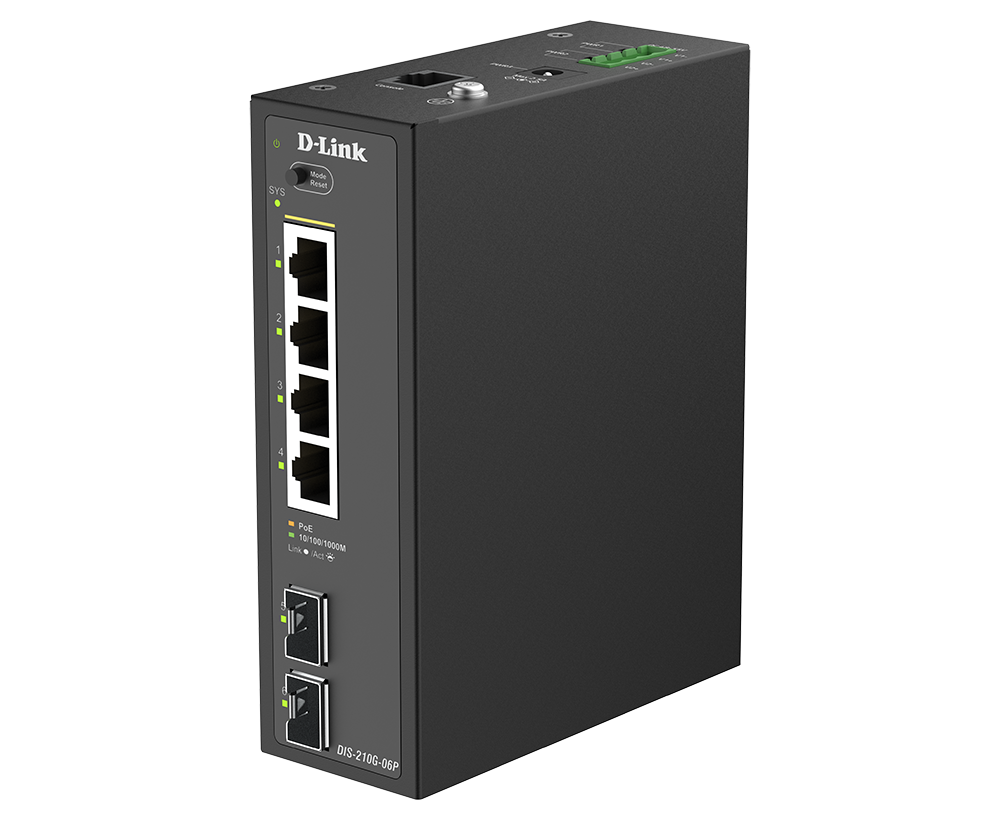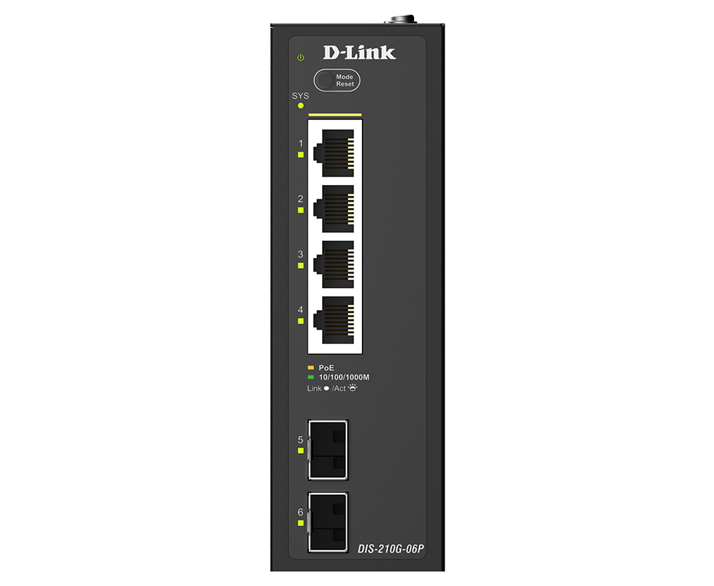 Le DIS-210G-06P est équipé de quatre ports PoE conformes aux normes IEEE 802.3af/at, permettant la transmission simultanée des données et de l’alimentation via un seul câble Ethernet.