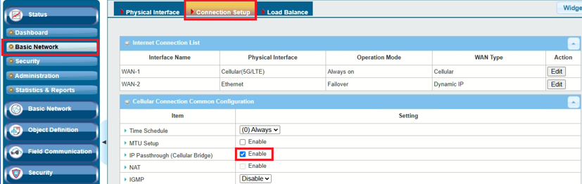 Go to Basic Network > Connection Setup > Cellular Connection Common Configuration tab