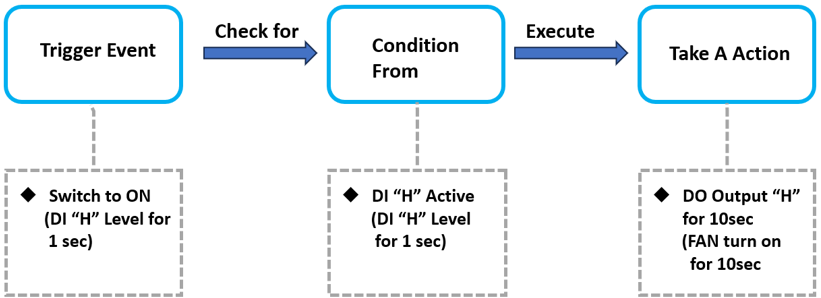 When DI receives an event (High for 1 second) from the "switch button", DO performs an action to turn FAN ON for 10 seconds.
