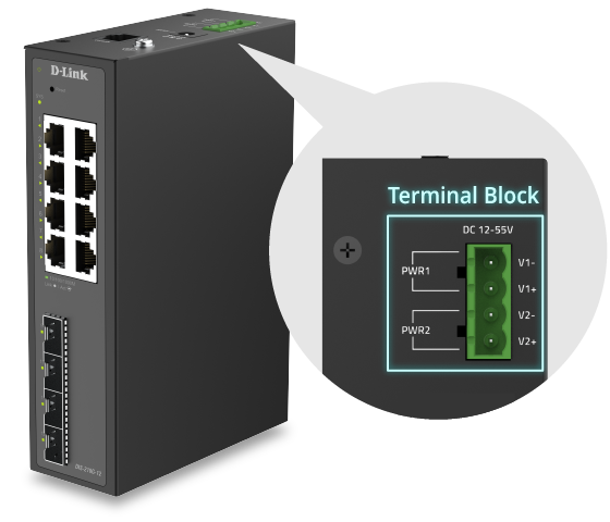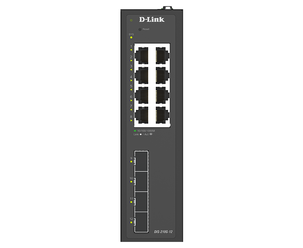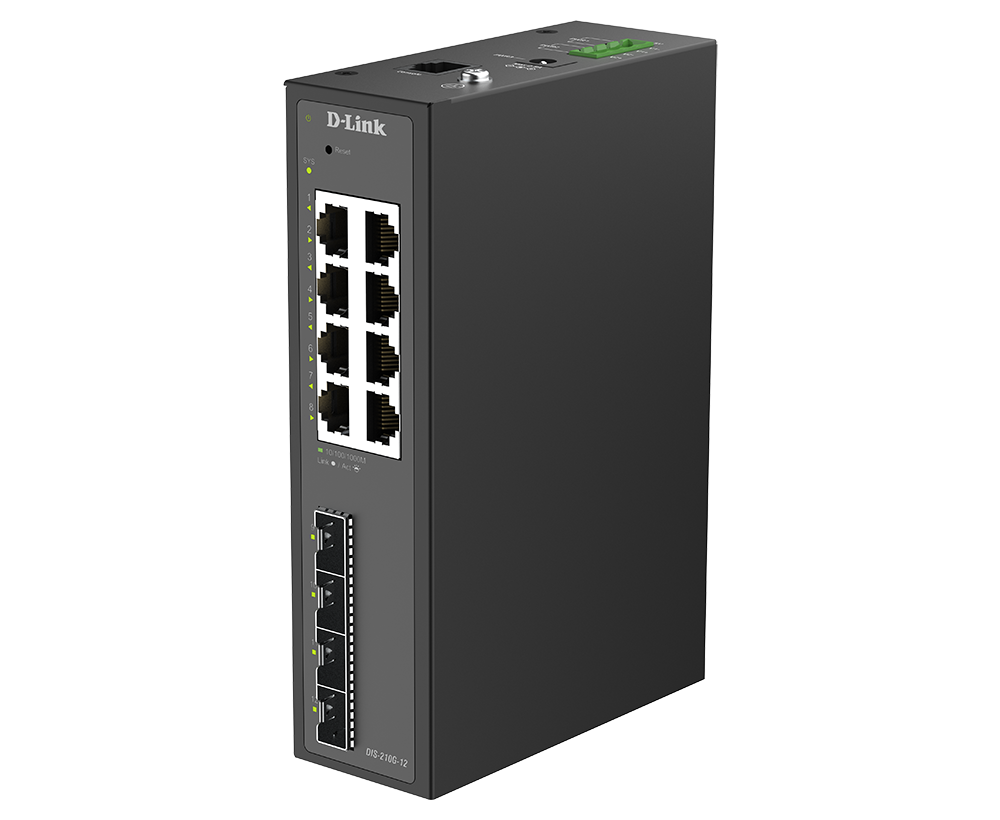 The DIS-210G-12 is an industrial smart switch equipped with eight 1G ports and four 1G SFP ports for network management and aggregation. The SFP ports support long-distance data transmission, rapid failover redundancy, and throughput aggregation. The DIS-210G-12 supports ERPS and static routing, which reduces latency, enables effective traffic control, and improves network scalability and efficiency.