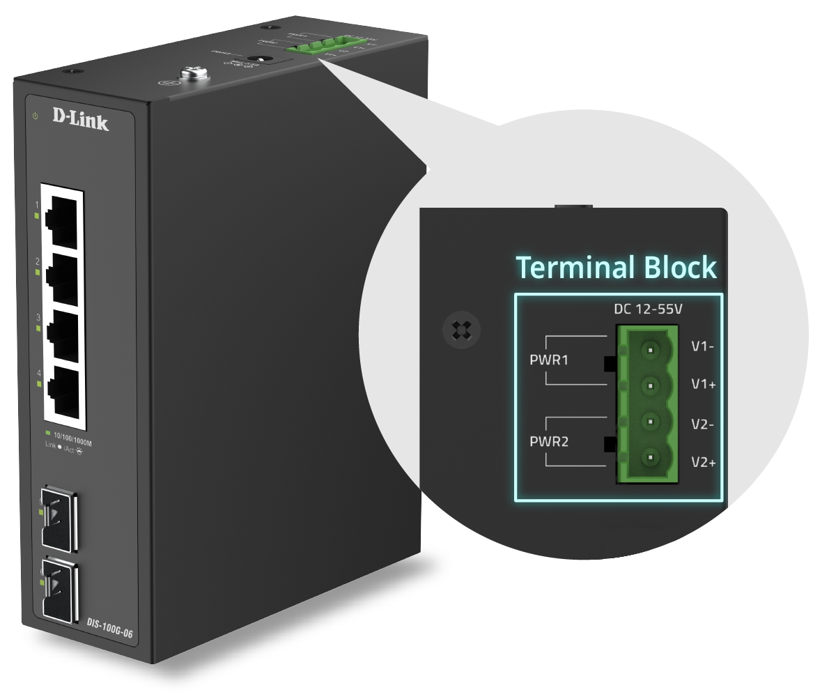 The DIS-100G-06 is equipped with dual power supply options. Each is capable of independently powering the device. This built-in redundancy ensures continuous operation even if one power source fails, minimizing shutdown risk and maintaining network performance. As industrial environments are common with unstable power conditions, its wide voltage range of 12 – 55V DC supports diverse power sources while protecting against surges and low voltage, delivering a stable and dependable power supply.