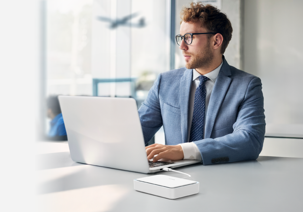 - Bärbar design: Passar i handflatan på 120 x 82 x 23,5 mm, perfekt för resenärer och distansarbetare