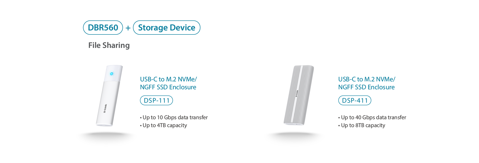 Connects your storage device with the DBR-560 to wirelessly access files on D-Link's Join N' Share platform anytime, anywhere