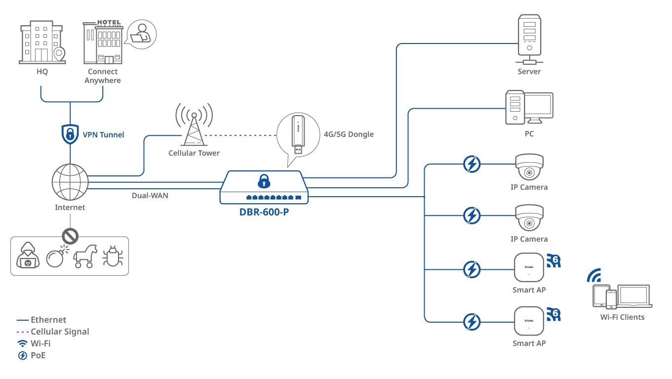 It offers high port density with 2.5G-speed connectivity and can rapidly and flexibly expand network capacity through its diverse interface. For teleworkers, the DBR-600-P ensures seamless access to the office network anytime, anywhere. For small offices, it effectively blocks malicious traffic, safeguarding your network. Additionally, the built-in management platform simplifies AP management, boosting efficiency and overall performance.