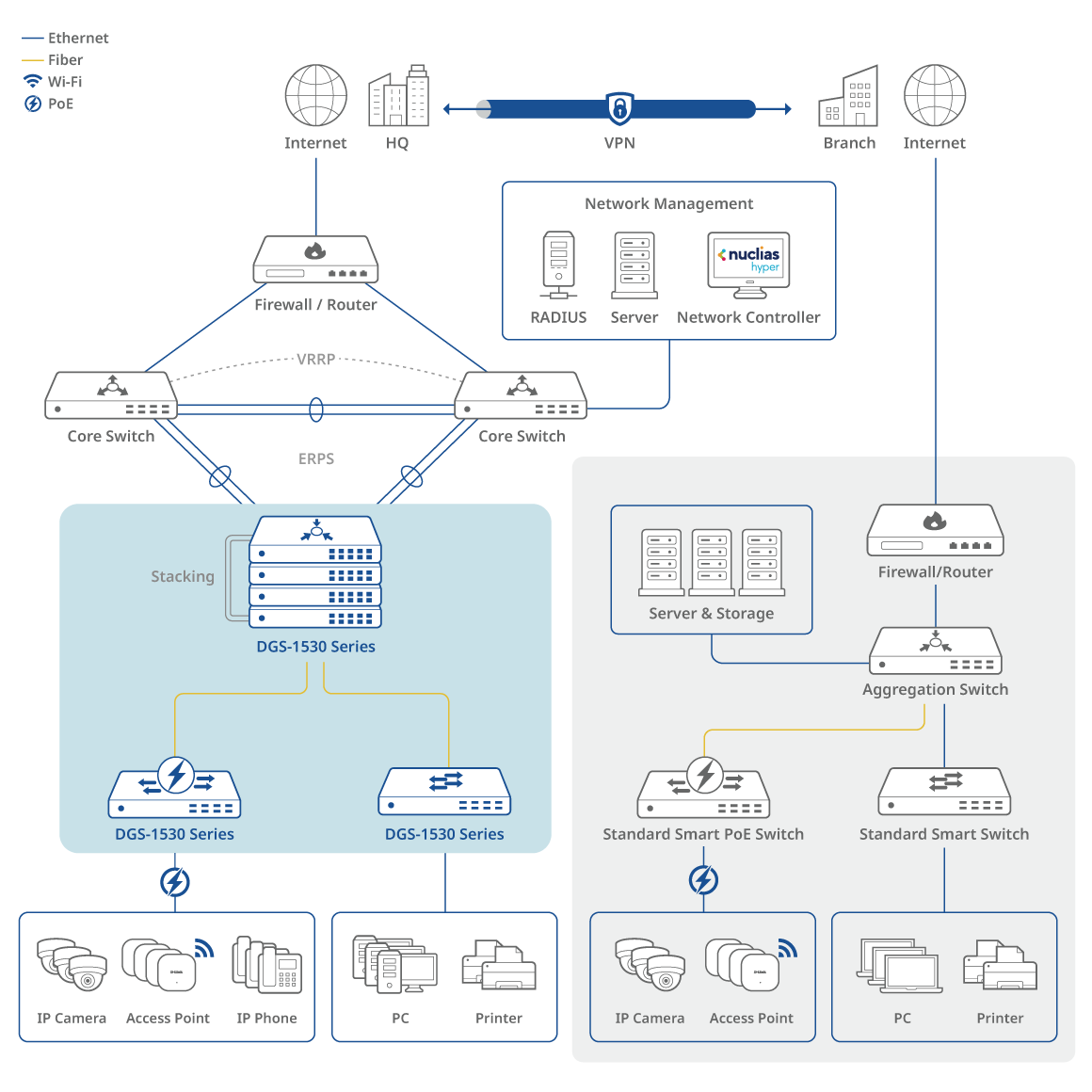 The DGS-1530 series offers scalable connectivity with 10 to 52 ports, including PoE and fiber options. It's perfect for IP surveillance, VoIP, and smart office networks, featuring VLAN, QoS, stacking and robust security like ACLs and 801.1X authentication.