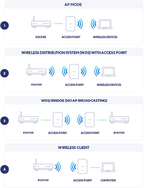 Access Point (AP) WDS bridge WDS with AP Wireless client |