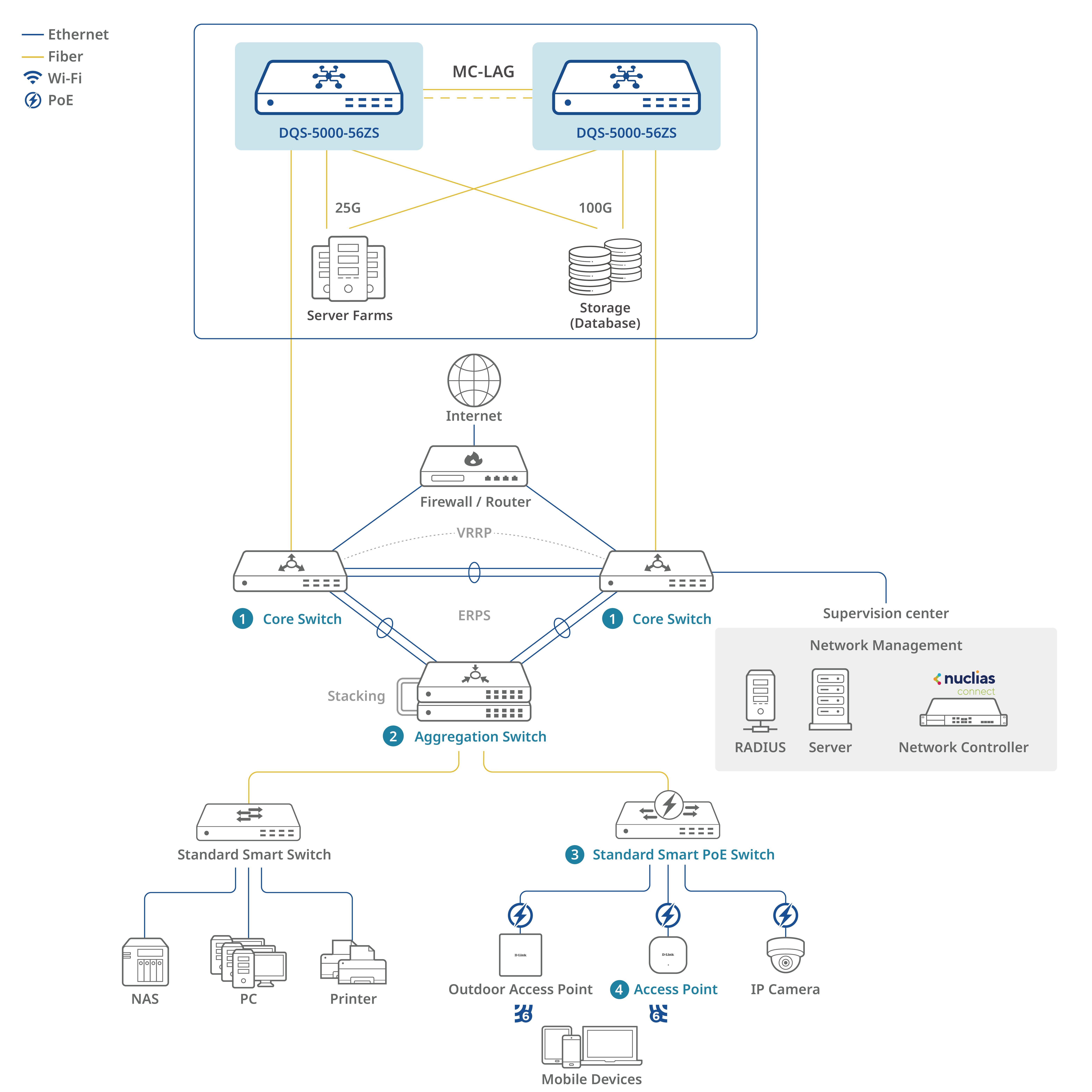 Traffic monitoring demands high-availability, high-performance network infrastructure. The DQS-5000-56ZS meets these needs with MC-LAG, hot-swappable PSU and fans, 25G downlinks for endpoint aggregation, and 100G uplinks for database and storage connectivity.