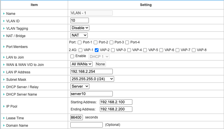 7. Assign a new VLAN ID (10) to the guest network and select the port member in 2.4G which the guest SSID belongs to. In this example, we use VAP-2.