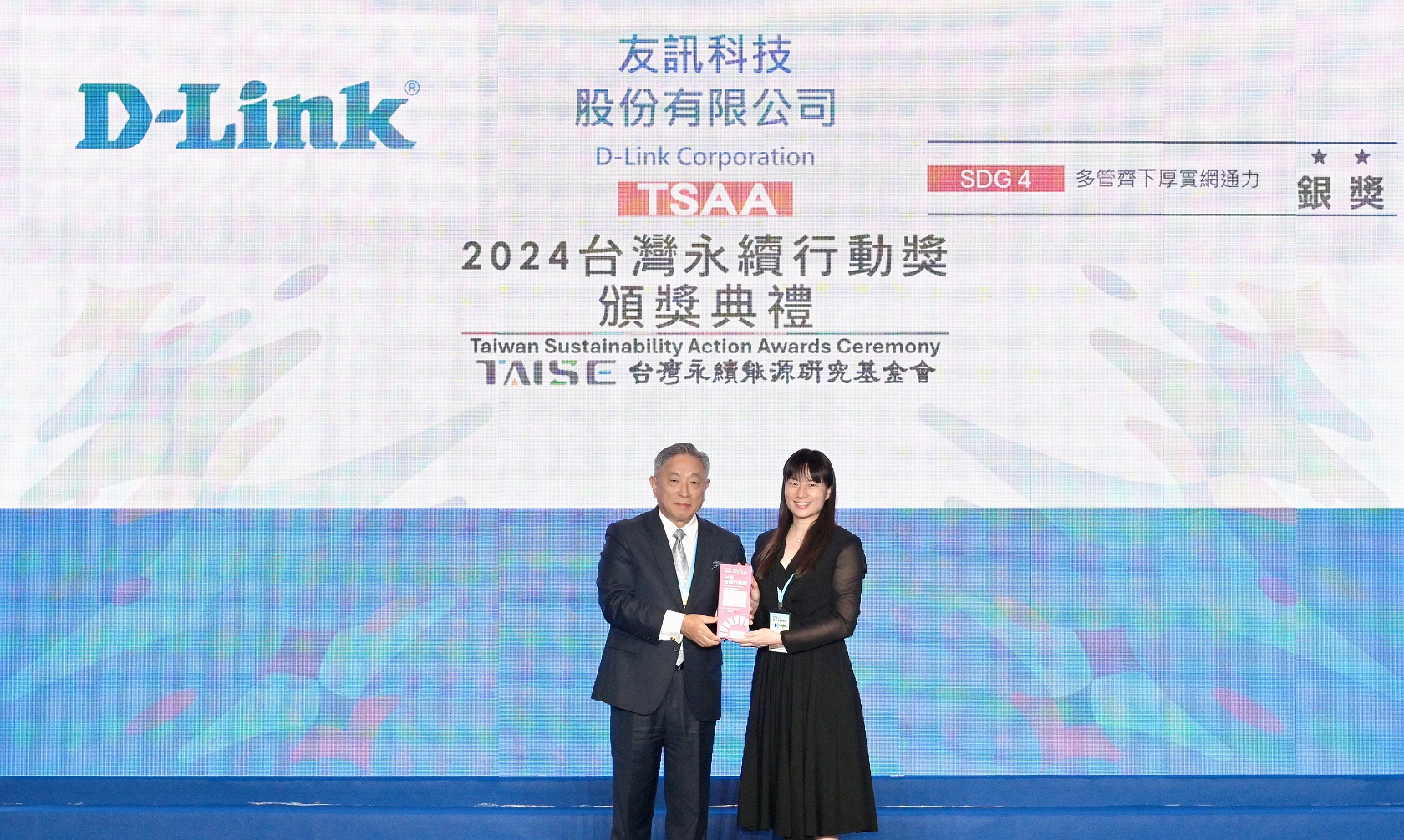 【2024/08/09】台灣永續能源研究基金會(TAISE)昨舉辦「2024台灣永續行動獎」頒獎典禮,全球網通領導品牌D-Link友訊科技(股票代碼:2332)首度參加,即由「多管齊下 厚實網通力」產業人才培育計畫榮獲銀獎,以實踐永續發展目標(SDGs)的創新與影響力、及推動社會與環境責任的堅定承諾受到肯定。由財務長陳宜代表受獎。