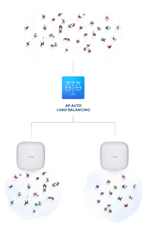 同時具備負載平衡和無線傳輸公平性技術,可將工作負載平均分配至各個 AP,實現最佳資源利用效率,並確保每個裝置皆能順暢連網,降低整體網路壓力。