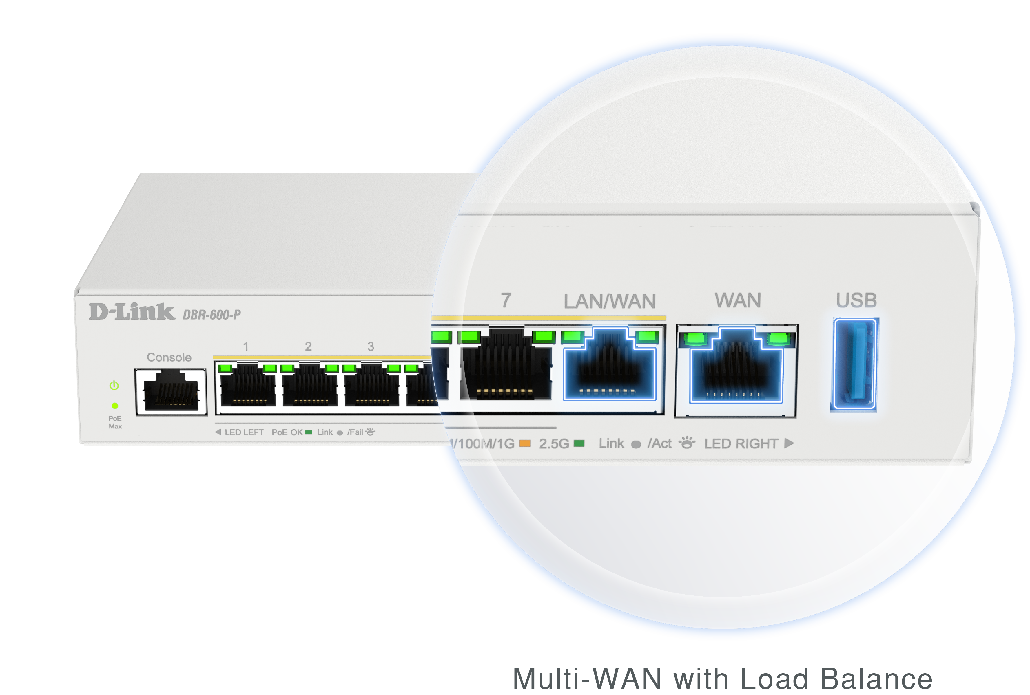除了一個可設定為備用 WAN 的 WAN/LAN 連接埠外,USB 連接埠不僅可透過與 D-Link 4G/5G 網路卡整合實現 WAN 故障轉移或負載平衡來擴展服務。