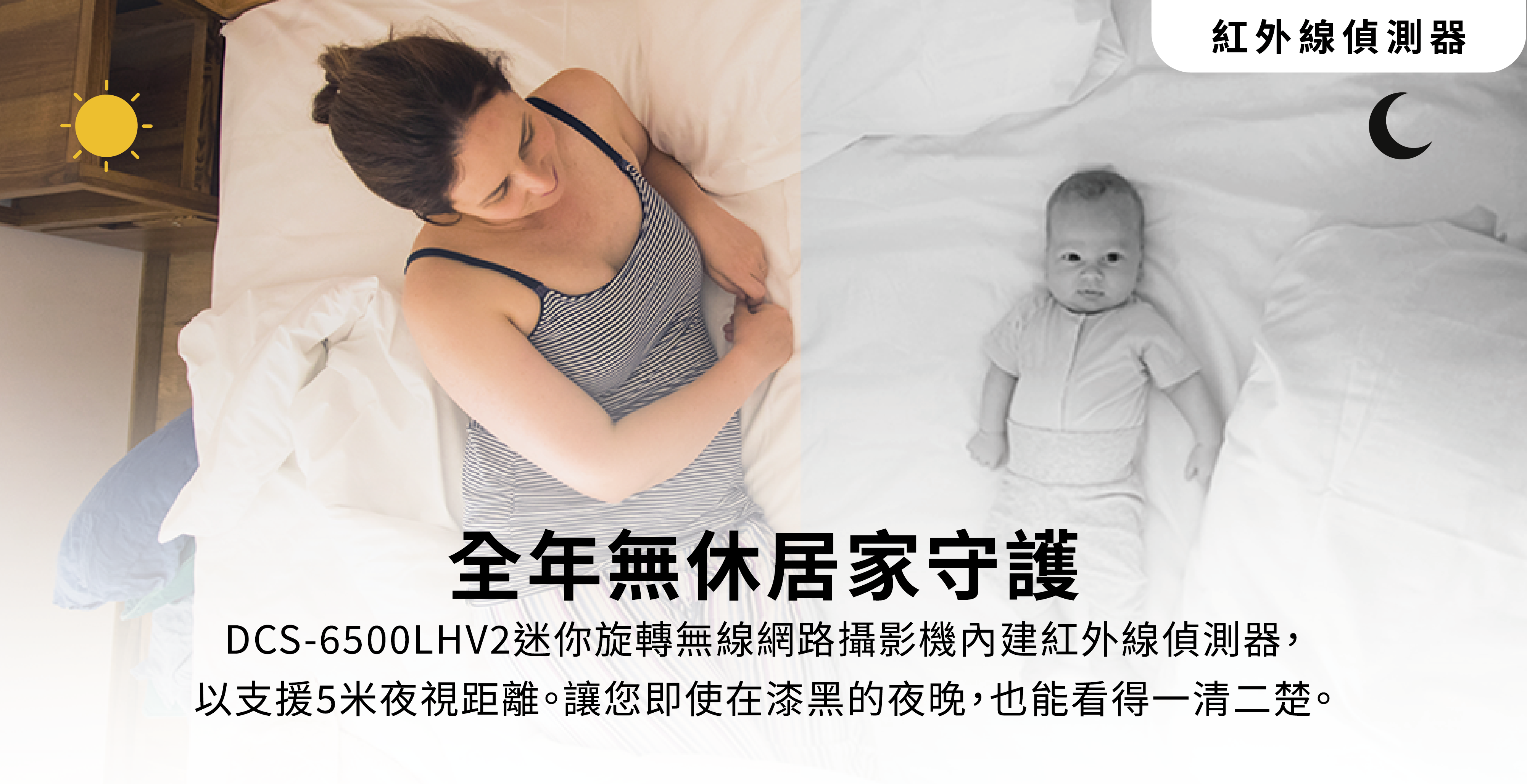 DCS-6500LHV2迷你旋轉無線網路攝影機為您提供旋轉水平340°、垂直90 °,可觀賞360°大範圍全景視野,無死角的監控畫面,水平與垂直搖攝技術與全景監看功能,讓您可以監看到屋內每個角落,為您打造更安全的居家環境。