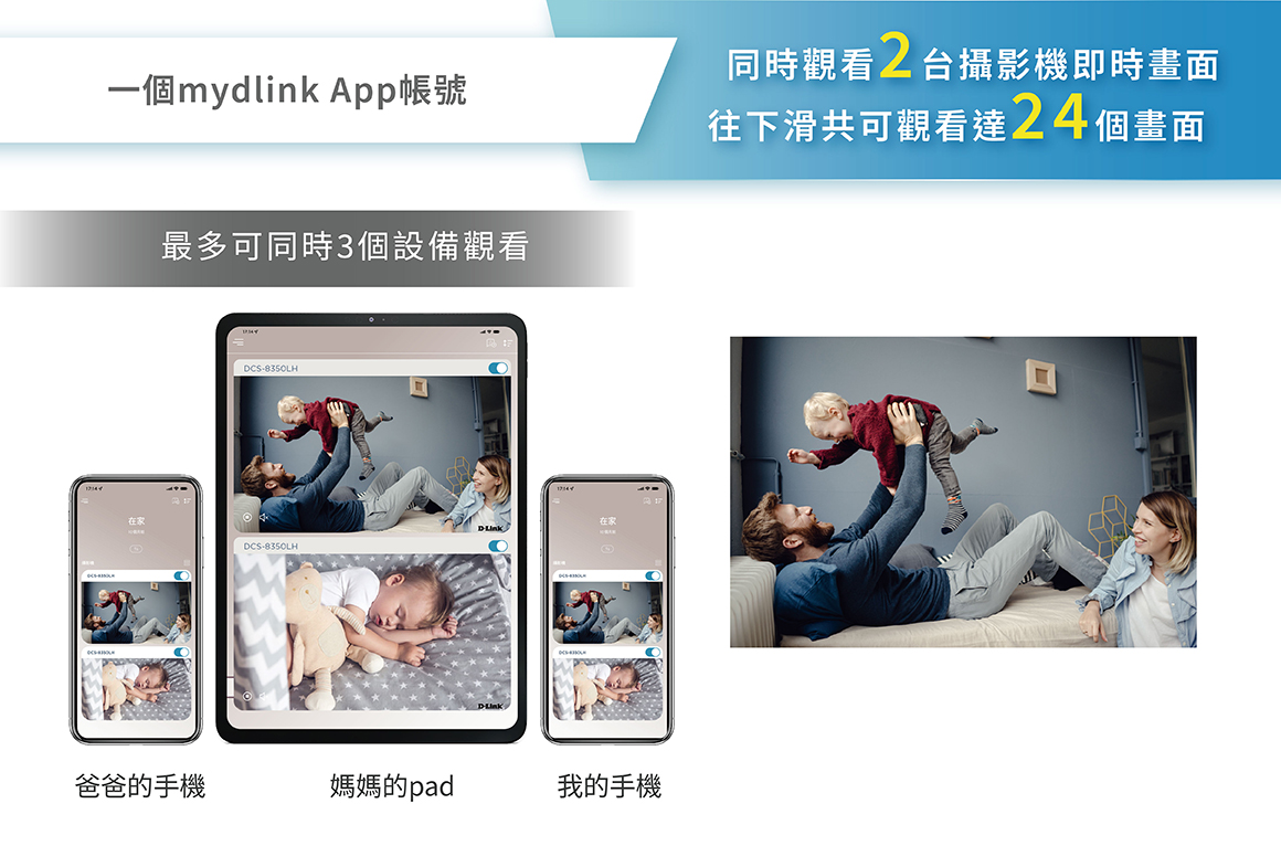 且能使用mydlink app遠端即時存取、播放並下載至手機或平板中。