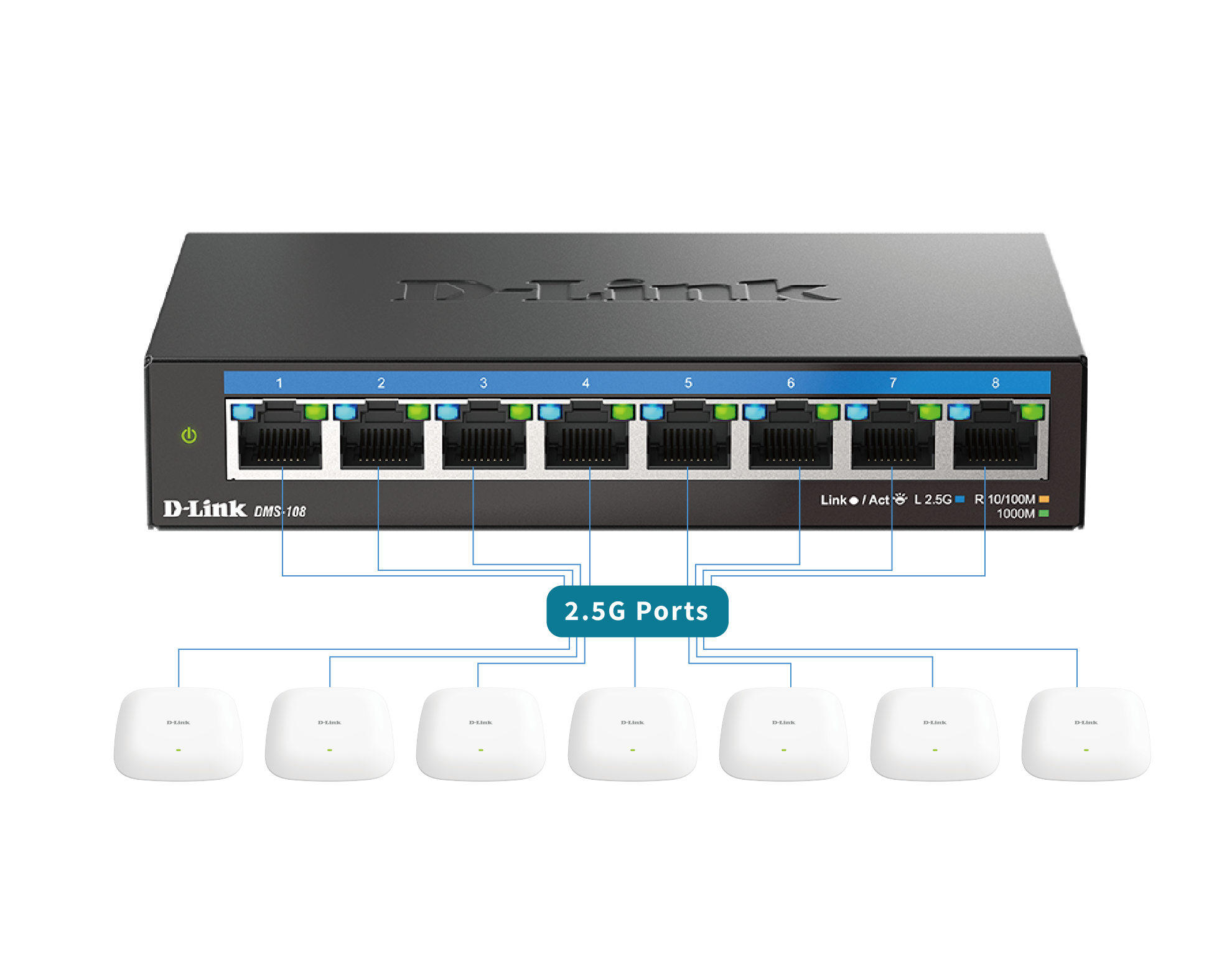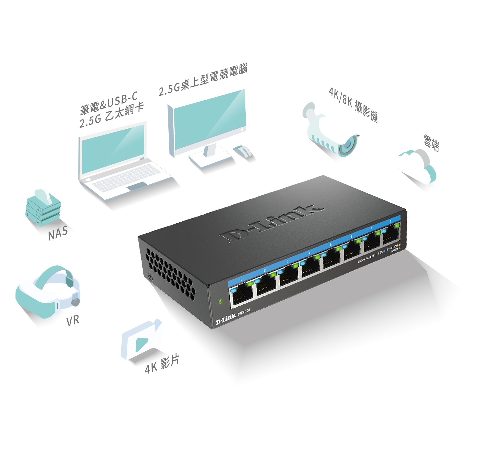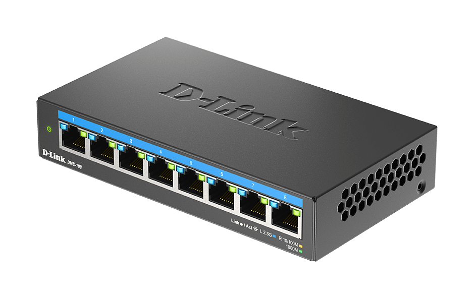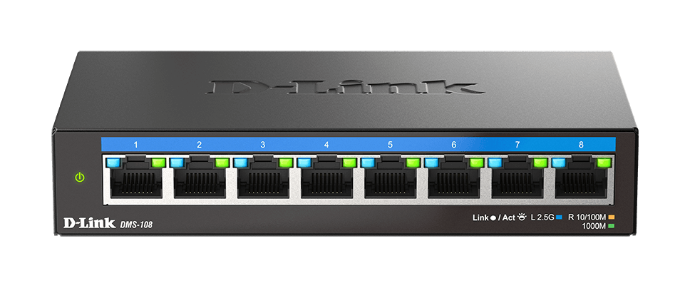 DMS-108 可自動偵測各網路埠所需的速度並自動協調網路流量,讓每個連網設備盡可能獲得最大速度。