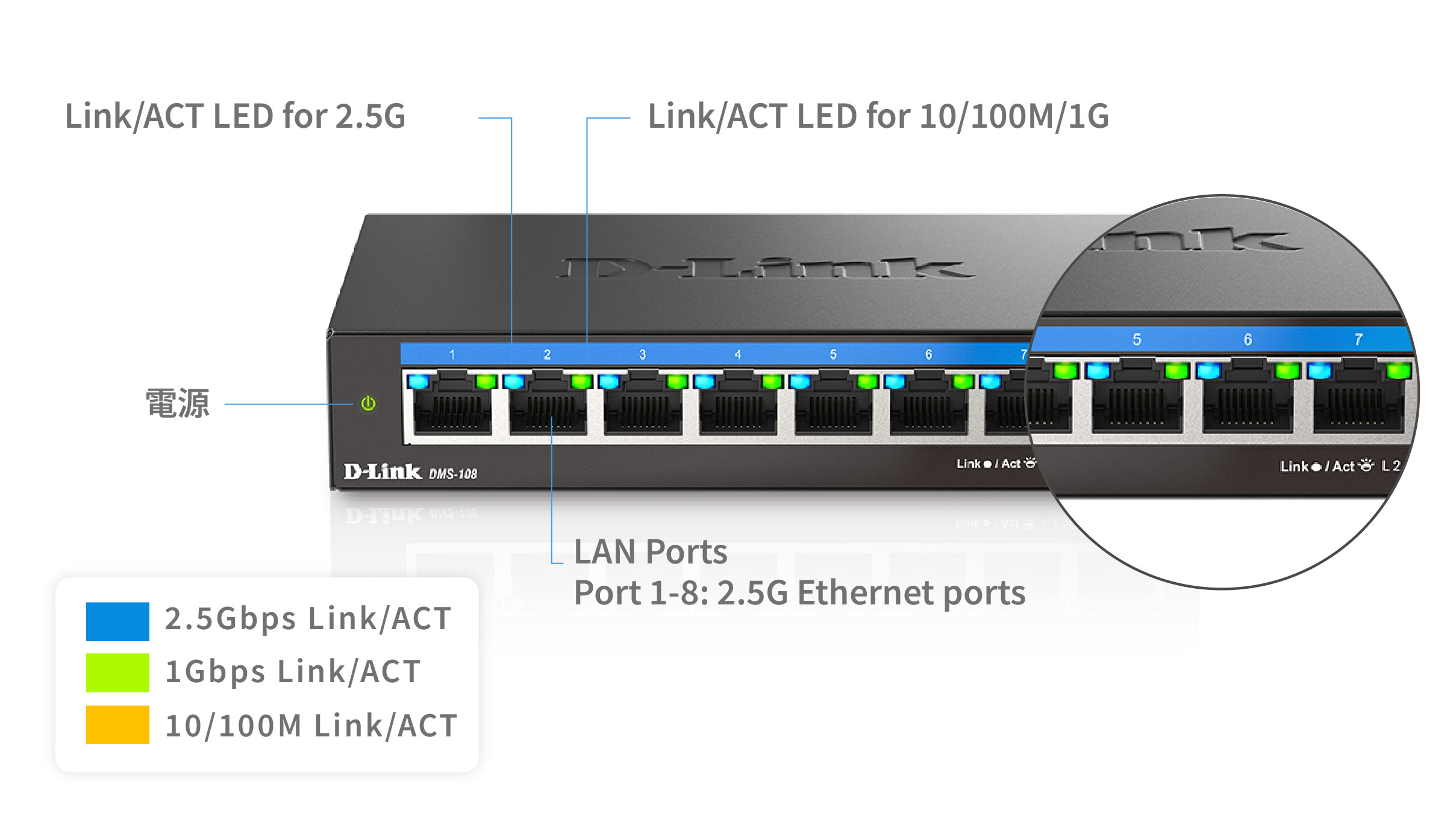 每埠網路端口都支援10/100Mbps/1G/2.5G速率,多種LED指示燈,幫助使用者輕鬆辨別設備目前運作速率以及設備狀態